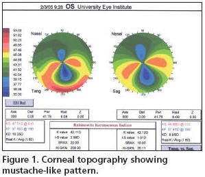 Mostly an inferior corneal disease, one study found that a small percentage (14.7 percent) may demonstrate superior PMD. This increases the diagnosis complexity by mimicking, at least by location, Terrien's marginal degeneration. PMD is usually characterized by a band of thinning inferior to the steepest protrusion that's apparent with either ultrasound pachymetry or a scanning slit topographer. Corneal topography will typically show a characteristic mustache-like steepened against-the-rule corneal pattern (Figure 1).