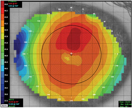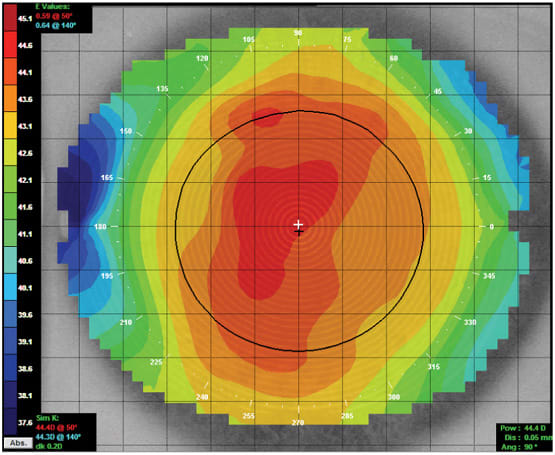 You can easily resolve a dry eye prior to topography capture by instilling artificial tears to "even" or "smooth" the fluid film layer. It's a little trickier to correct for a disrupted epithelium that limits the accuracy of the instrument in reading the shape of the cornea.