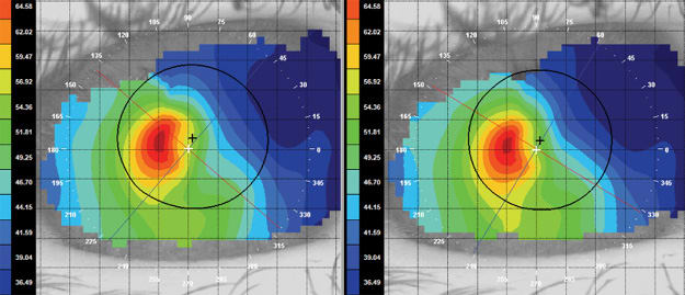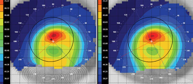 For example, Figure 4 shows two consecutive topography captures of the same right eye taken within seconds of each other. Note the significant difference in both shape and curvature (12.80D difference between apical curvature readings). Which is the valid interpretation, or is either one an accurate determination of the true shape of the cornea?