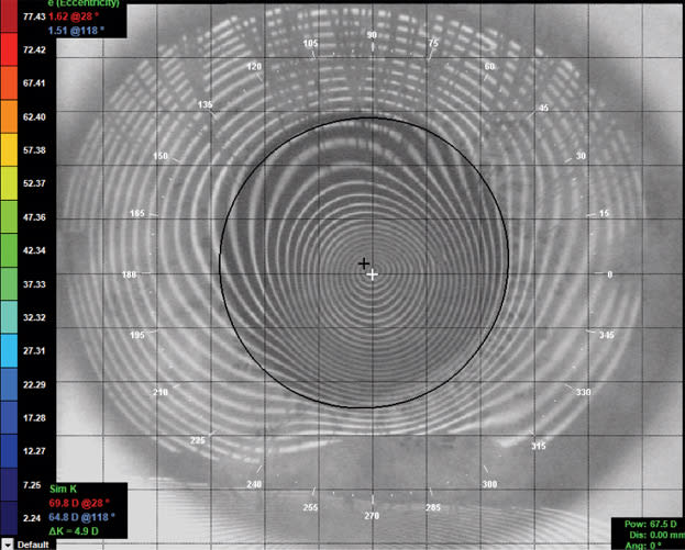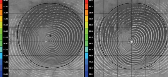 To help determine which capture may be valid, a cursory glance at the photokeratoscope image (Figure 5) shows significant distortion and breaking of the rings, resulting in extrapolation error. This error is the cause for our two captures (taken seconds apart) appearing so dissimilar.
