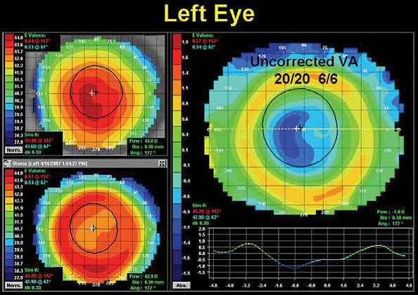We instructed him to continue the modality and return for follow up in one week. At that time he had an uncorrected visual acuity of 20/20 in both eyes and excellent overnight comfort with the lenses. Topography showed well centered treatment zones with a –1.00D correction in both eyes (Figures 2 and 3). The patient currently sleeps with the everted lenses every other night. He continues to report "perfect" visual acuity throughout his 48 hours of no lens wear.