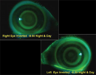 Figure 1. Fluorescein patterns of our subject's everted –9.50D Night & Day lenses. Note the reverse geometry-like patterns OU.