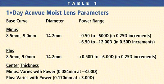 Vistakon designed 1?Day Acuvue Moist to simulate the mucin layer of the natural tears, to reduce friction and lysozyme absorption and to enhance moisture retention. The lens has a 58 percent water content.
