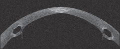 We performed anterior segment OCT on the patient's right eye (Figure 2). You can easily see the central corneal thinning, the profile and depth of the ring segments and the posterior budge adjacent to the Intacs.