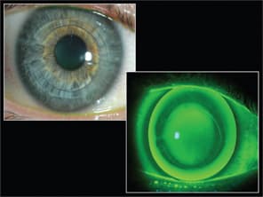 A male patient reported a long history of contact lens intolerance secondary to unilateral keratoconus. He underwent Intacs surgery to his right eye in 2006. His postoperative Ks were OD 51.37 @ 161/54.37 @ 71. His non-keratoconic left eye had Ks of 43.62 @ 90/43.87 @ 180 with a refractive error of plano and a visual acuity of 20/20. He was referred to our practice for lens management of his high anisometropia and central irregular astigmatism.
