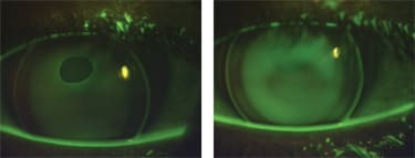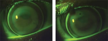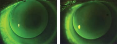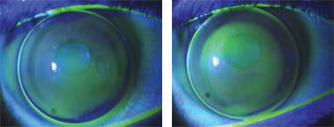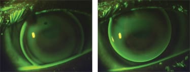 OZD control is also crucial for proper alignment and sometimes for vision. If your patient is experiencing glare or other visual complaints, possibly due to a small OZD, and a good fitting relationship is present, typically you should increase the OZD. This may result in bubbles or midperipheral bearing. You could also control this scenario by increasing eccentricity to maintain the aligned fit. As the OZD increased in the patient's left eye, a bubble appeared, but was eliminated with an increase in eccentricity (Figures 7a and 7b).