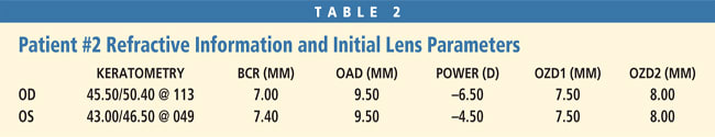 Table 2 lists the refractive and current GP contact lens specifications for Patient #2. Figure 5 shows the baseline corneal topography maps for this keratoconus patient. We refit him into GP lenses with controllable e-values with two different OZDs. We increased e-values in the same way as for our first patient.