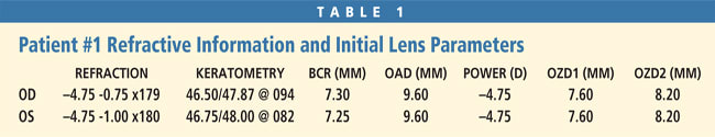 Table 1 lists the refraction, keratometry and lens parameters for Patient #1, and Figure 1 shows the topography. We empirically fit this patient with standard tri-curve GP lenses of two different optical zone diameters (7.6mm and 8.2mm). Following the initial fit, we placed lenses of increasing e-values for both optical zone diameters on each eye and photographed them in order.