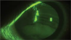 We diagnosed a mechanically induced corneal abrasion, presumably from debris from his pillow that lodged beneath the lens during sleep (Figure 2). We treated him for symptomatic pain relief and prescribed Vigamox (Alcon) six times per day as prophylaxis against infection. Within 24 hours the abrasion was 95 percent resolved with no epithelial defect and only faint stippling of the epithelium in the site of the previous abrasion.