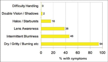 Baseline Outcomes All subjects subjectively expressed symptoms of dryness or discomfort with their habitual lenses at the baseline visit. Eighty-four percent reported dryness after two hours of contact lens wear, 20 percent had received a dry eye diagnosis from their practitioner and 46 percent thought they had dry eyes. Figure 1 summarizes symptoms with subjects' habitual contact lenses, with 94 percent reporting dryness, grittiness or burning sensation on a subjective questionnaire.