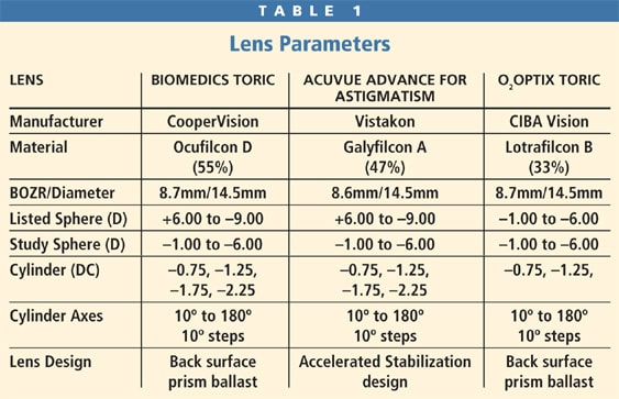 Fifty-one subjects completed a prospective, six-week daily wear, investigator-masked, crossover study at three different sites. A comprehensive baseline evaluation was conducted to determine eligibility and to establish baseline subjective and objective findings. Subjects completed a detailed dry eye questionnaire at the baseline and at the termination of the study. Subjects wore three pairs of soft toric lenses bilaterally (Table 1) in random succession.