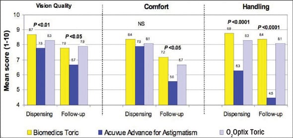 At two-week follow-up, Biomedics Toric and O2Optix Toric rated significantly better than Acuvue Advance for handling (P<0.0001), comfort (P<0.05) and vision quality (P<0.05) (Figure 2).