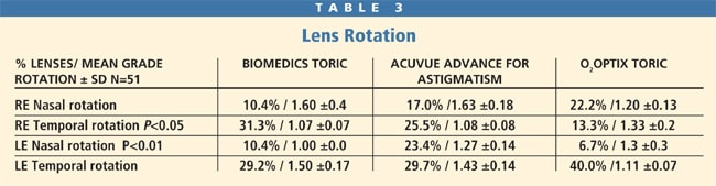 Lens rotation analysis revealed that there were significant differences in the proportion of lenses rotating among groups (Table 3). A significantly lower proportion of O2Optix Torics rotated temporal in the right eye compared to Biomedics Torics or Acuvue Advance for Astigmatism lenses (P<0.05). A lower proportion of Biomedics Torics and O2Optix Torics showed nasal rotation in the left eye than did Acuvue Advance for Astigmatism lenses (P<0.01). Lens rotation grades were low, ranging from 1.00 to 1.63 (where 1 = 5 degrees to 10 degrees and 2 = 10 degrees to 15 degrees), with no significant differences between rotation degree grades among lenses.