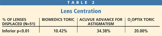 Lens Fit Characteristics In terms of lens centration (Table 2), Biomedics Toric displaced inferiorly significantly less frequently than did Acuvue Advance for Astigmatism or O2Optix Toric (P<0.01). One-third of Acuvue Advance for Astigmatism lenses displaced inferiorly compared to one-tenth of Biomedics Torics or one-fifth of O2Optix Torics (P<0.01). None of the lenses displaced nasally. We determined the significance by Chi Square test, which determines whether displacement is more than expected based on average combined displacement for all three groups.