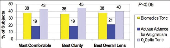 Forced Choice Outcomes At the final follow-up visit, subjects responded to a forced choice decision. When presented with a forced choice for the best performance in terms of comfort, vision clarity and overall best lens, Acuvue Advance for Astigmatism was the least preferred of the three designs evaluated (P<0.05). There were no statistically significant differences in preference between Biomedics Toric and O2Optix Toric. O2Optix Toric ranked highest most often in all categories, with Biomedics Toric a close second.