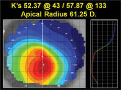 Additionally, the flatter superior corneal topography becomes one of the more important considerations in fitting rigid lenses for keratoconus. It's at the flatter superior portion of the cornea that the rigid lens will be tightest. Along the horizontal meridian, there's a surprising degree of corneal symmetry (Figure 2).