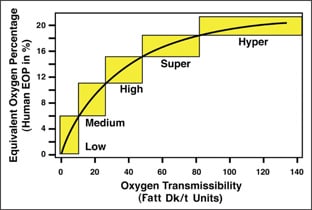 Oxygen permeability (Dk) of a traditional hydrogel material is limited due to the water content of the material. The highest practical water content for a hydrogel lens is about 80 percent, so a hydrogel's hydrated permeability (Dk) could reach a maximum of 40 to 50 Fatt Dk units (Figure 1).