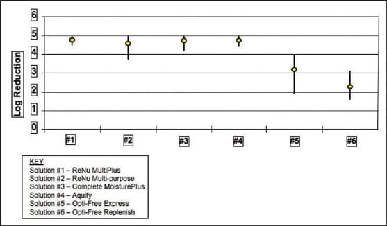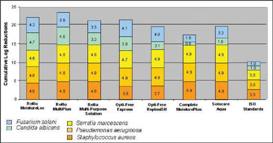 Figure 1. Contact lens care solutions all perform quite well when compared to the ISO standards for stand-alone biocide.