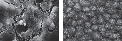 Tchao and coworkers (2002) reported on the use of sodium fluorescein permeability assays in vitro to study the effects of various disinfecting solutions on the integrity of the epithelium. Figure 4 shows the physiologic damage done to the cell cultures following exposure to PHMB and non-PHMB solutions. The image on the left shows that tight junctions between the cells of the epithelial culture were compromised with a non-PHMB solution but were not compromised with a PHMB-based solution. This study was performed on kidney cell cultures. In this standard cytotoxic assay, the effect on cells seems to be worse with a non-PHMB solution.