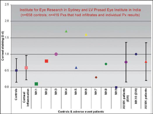Figure 6. Dr. Sweeney's work shows no correlation between the extent of corneal staining and microbial keratitis.