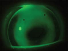 Once you've achieved the desired central fluorescein pattern, evaluate the peripheral curve system, which can be modified in a step-wise fashion. Both the Dyna Z Intra-Limbal lens and Rose K2 IC offer the option of altering the peripheral curve by quadrant. When fitting irregular corneas, excessive edge stand-off at 6 o'clock is common. In such cases, you can resolve the excess lift by ordering the lens with a quadrant steeper than what is specified for the remaining portion of the lens.