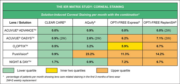 1. Updated Results Table 1 presents the IER Matrix updated results. The Acuvue Oasys (Vistakon) with Aquify (CIBA) rate was updated from 2.5 percent in the first report to 2.6 percent in this report because of the availability of additional visit data. The Oasys with Opti-Free Express (Alcon) rate now appears orange (highest quartile), whereas in the original IER Matrix staining table it was yellow (middle two quartiles). This is because both the overall rate for all patients and confidence intervals changed slightly with the addition of the Night & Day results.