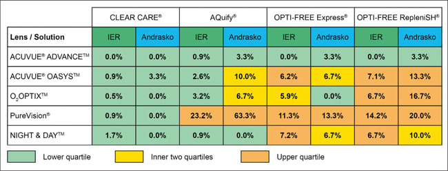 Night & Day lenses behave similarly in the IER Matrix to Acuvue Oasys and O2Optix, falling into the lowest quartiles for Aquify and Clear Care and in higher quartiles for Opti-Free products.