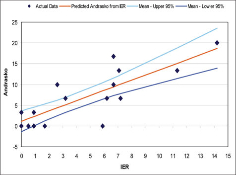 • The most obvious prediction failures are the four cases in which the Andrasko result was zero whereas IER rates ranged up to 6 percent as well as the six cases in which the IER data was approximately 6 percent to 7 percent and the Staining Grid varied from 0 percent to 17 percent.