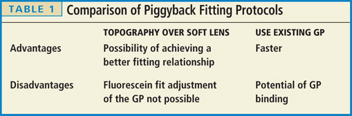 When you have labored industriously to find a best fitting (or as good as can be expected) GP lens for a particular cornea and there is still occasional erosion or insurmountable discomfort, you can apply a soft contact lens to protect the cornea and reapply the GP on top. There are both pluses and minuses with this technique. On the plus side, it's quick and easy and utilizes existing resources. On the other hand the fitting relationship between the two lenses is likely to be less than optimal (Table 1).