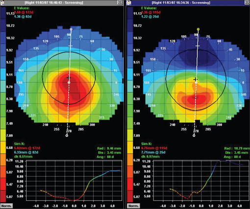 Figure 1. Two axial maps of the same eye. The first, on the right, is without a soft contact lens while the left image shows the soft lens in situ. The smoothing of the distortion with the soft lens is evident.