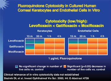 Figure 5. In vitro studies have also shown Iquix to be the least cytotoxic of the broad-spectrum fluoroquinolones to corneal keratocytes and endothelial cells.