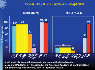 Nevertheless, Ocular TRUST did show that incidence of methicillin-resistant S. aureus (MRSA) is rising. In laboratory testing, most antibiotics, including the newer-generation fluoroquinolones, have limited efficacy against MRSA and methicillin-resistant S. epidermidis (MRSE).