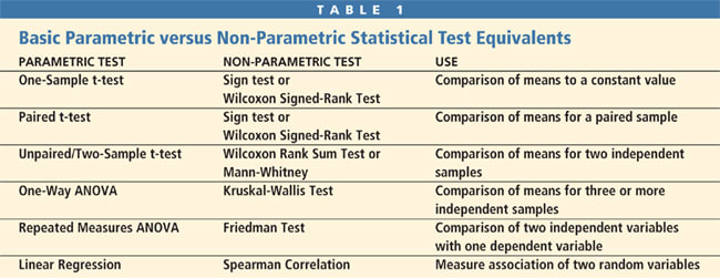 It's very easy for people to become a little cynical regarding statistics. Some people believe that statistics can be manipulated to provide a desired result. The truth is that statistical tests are tools and, as with any tool, the statistical tests selected for a study should match the job required. In general, statistical tests can be broken down into two main categories: parametric and non-parametric statistics. Parametric statistics are commonly utilized in large clinical trials and include tests such as the student t-test and analysis of variance (ANOVA). In studies in which the sample size is limited, such as pilot studies, or when a study deals with data values that are not a continuous measure, such as grading scales for corneal staining, non-parametric statistics are typically used. Most parametric statistical tests have a non-parametric equivalent. Table 1 shows a summary of common parametric tests, their non-parametric equivalents and their use.