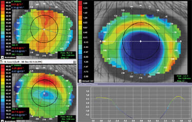 Following the slit lamp exam and acuity evaluation, corneal topography is performed. The technician takes one or two maps, then selects the subtractive map function and compares the baseline (pretreatment map) against the morning post-treatment map. The technician analyzes the subtractive map on each eye using three separate topographical interpretations:
