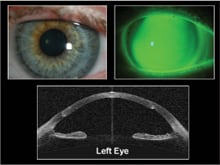 A 36-year-old female underwent bilateral corneal transplants for keratoconus in Budapest, Hungary in the mid 1990s. She was referred to our specialty clinic at Pacific University because she could not tolerate her current GP lenses for more than two hours a day. The patient had failed with more traditional corneal lens designs and most recently had been fitted with scleral GP lenses.
