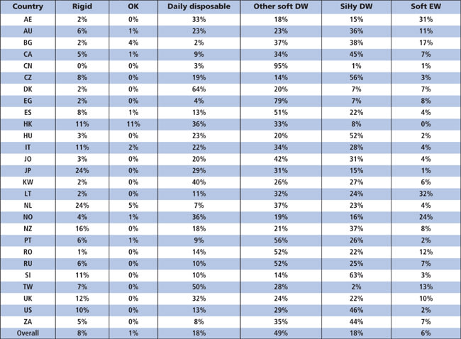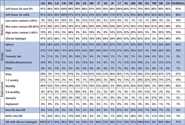 Table 4. Detailed information for prescribed soft lenses only. See Table 1 for country abbreviations. Data presented for countries reporting >300 lens fits. EW = extended wear. Data for materials, designs and replacements pertain to daily wear new fits only.