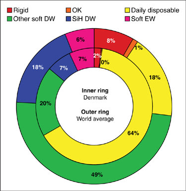In all markets, soft lenses were prescribed for a large majority of wearers, from 71 percent in the Netherlands to 100 percent in China. Daily disposable lenses continued as the lens type with the most varied frequency of prescribing around the world. In Denmark, respondents prescribed 64 percent of all wearers with daily disposables lenses, a value that rises to 87 percent if only daily wear spherical soft lenses are considered. In fact, Denmark's high use of daily disposables and relatively low use of silicone hydrogels for daily wear makes it the contact lens market that is most disparate from the global average (Figure 3). Daily disposable lenses account for less than 10 percent of lenses prescribed in markets such as Canada, China and the Netherlands.