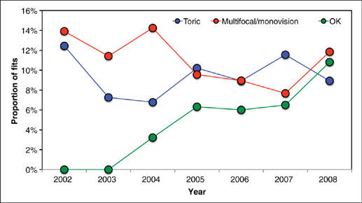 Rigid lens prescribing accounted for 9 percent of fits (including 1 percent of fits for orthokeratology) (Table 2), the same values as for 2007. Japan and the Netherlands again reported high levels of rigid lens use, each at 24 percent of all lens fits. Orthokeratology prescribing appears to be focused on a small number of markets of relatively high activity (4 percent or more of all fits): Bulgaria, Hong Kong and the Netherlands. Overall, the proportion of orthokeratology lenses has risen from 0 percent to 11 percent of rigid lens fits in recent years (Figure 2), albeit against the declining use of rigid lenses in general (14 percent of all fits in 2002 to 9 percent in 2008).