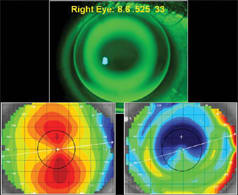 The topographical changes that take place in corneal reshaping, or orthokeratology, result from unequal fluid forces beneath the lens. The posterior shape of these lenses results in fluid pressure forces that are positive (push force) in the center of the cornea and negative (pull force) in the midperiphery. Therefore, a key requirement is that an orthok lens must "land" peripherally approximately 360 degrees around the cornea to contain the fluid forces. If corneal astigmatism is limbus-to-limbus rather than central (Figure 1), the fluid forces escape along the steep meridian and the desired topographical changes cannot occur.
