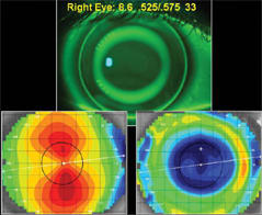 Our patient is a 25-year-old male with 2.87D of corneal astigmatism OD and OS. Figure 3 shows a traditional Paragon CRT lens OD. Note the decentered lens position and excessive edge lift along the steep vertical meridian. Overnight wear of this lens resulted in a decentered, superior-positioned treatment zone.