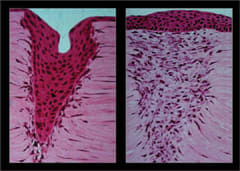Figure 1. The left image shows an epithelial plug formed within the walls of the gaping wound. With time, the plug is pushed out and replaced with scar tissue.