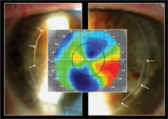 This month's case involves a 32-year-old male who underwent penetrating keratoplasty to his left eye for keratoconus. Postoperatively he had 12.50D of against-the-rule astigmatism (Figure 2). Numerous fitting attempts with a wide range of contact lenses failed to provide the patient with adequate comfort and/or vision. The patient was referred back to his surgeon for an astigmatic reduction procedure and underwent a relaxing incision in 2008, which reduced his astigmatism to 3.00D (Figure 3). Today, he wears a high-Dk GP lens on his left eye with 20/20 acuity and all day comfort.