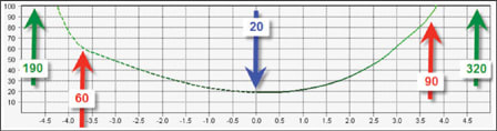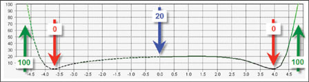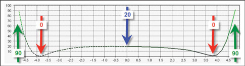 Surface Area of Bearing A practitioner can "soften" how the GP lens bears on the peripheral cornea by increasing or decreasing the optical zone. Determine the flat axis that will exhibit the greatest bearing of the lens on both sides of the cornea. Observe the tear profile on the graph on this flattest meridian. Note that by changing the optical zone diameter (OZD) width, the surface area of contact with the cornea can increase or decrease. It is desirable to create a lens with more peripheral contact rather than less as narrow areas of bearing could impinge, bind, and produce discomfort and molding. Observe how changes in OZD, smaller (Figure 11) or larger (Figure 12), alter the point of greatest bearing along the horizontal meridian and the volume and depth of tears at the edge.