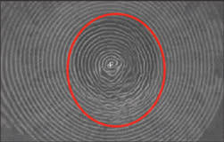 Figure 6. Note the distorting, breaking, and collapsing of rings inside the red circle. This would result in analysis error (extrapolation error). A quality topography capture should exhibit rings that look even and parallel as most appear outside the red circle.