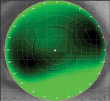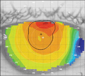 Most of you are probably familiar with creating a GP fit that has definite apical clearance across the central back optical zone of the lens. We do not typically quantify the tear layer thickness in microns (μm) but rather qualify the central clearance as inadequate, acceptable, desirable, or excessive. An advantage of corneal topography fitting software is that it allows us to design contact lenses to a micron level of tear layer thickness between the lens and cornea. In other words, we can calculate a specific apical clearance rather than "guesstimating" based on the in situ appearance.