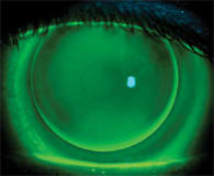 The base curve radii (BCR) you choose should create an apical clearance of between 20μm to 30μm (Figures 4 and 5). Apical clearances >40μm may produce apical steepening and spectacle blur, and the pattern will exhibit the appearance of excessive central clearance. In such cases simply flatten the BCR, or steepen the BCR if the apical clearance is <20μm, to produce a central or apical tear film thickness of approximately 20μm to 30μm between the contact lens and cornea.