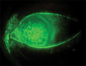 This photograph shows a bandage soft contact lens on the left eye of a patient who has bullous keratopathy. The patient unfortunately experienced an acute angle closure attack as an infant and has never had useful vision with the affected eye. His previously high eye pressure and inflammation damaged his endothelium and he developed mild bullous keratopathy. He had been using Cosopt (Merck & Co.) b.i.d. OS and Muro 128 (Bausch & Lomb) drops OS as needed.