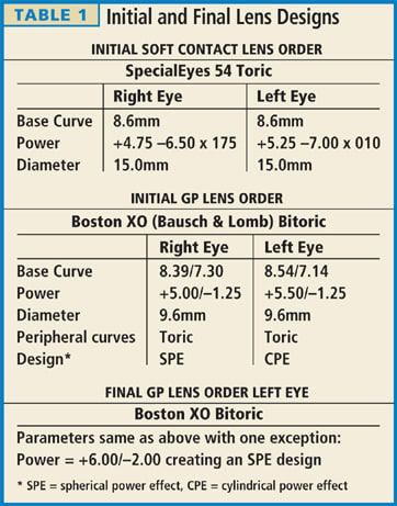 Although GP lenses were recommended, the patient also wanted to try soft lenses (Table 1). Due to the high degree of astigmatism, we ordered the GP lenses empirically with the steep meridian 0.75D flatter than the K reading.