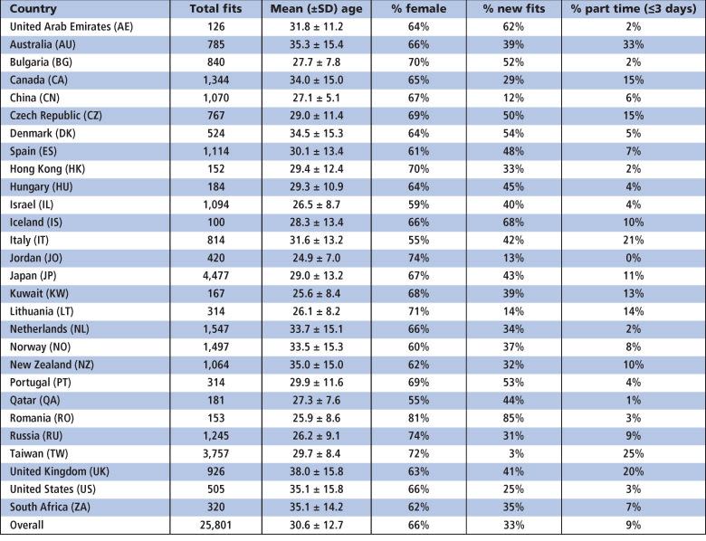 Table 3. Detailed information for prescribed rigid lenses only. See Table 1 for country abbreviations. Data presented for countries reporting >35 rigid lens fits. EW=extended wear.