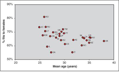 Figure 1. The proportion of contact lens fits to females versus mean wearer age.
